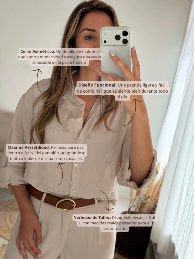 La Camisa Helena destaca por su equilibrio entre simplicidad y sofisticación. Su diseño clásico se ve renovado por una sutil asimetría en el largo, lo que permite un calce favorecedor para distintos tipos de cuerpo. Es una prenda cómoda y funcional, pensada para ser el comodín definitivo de tu guardarropa.