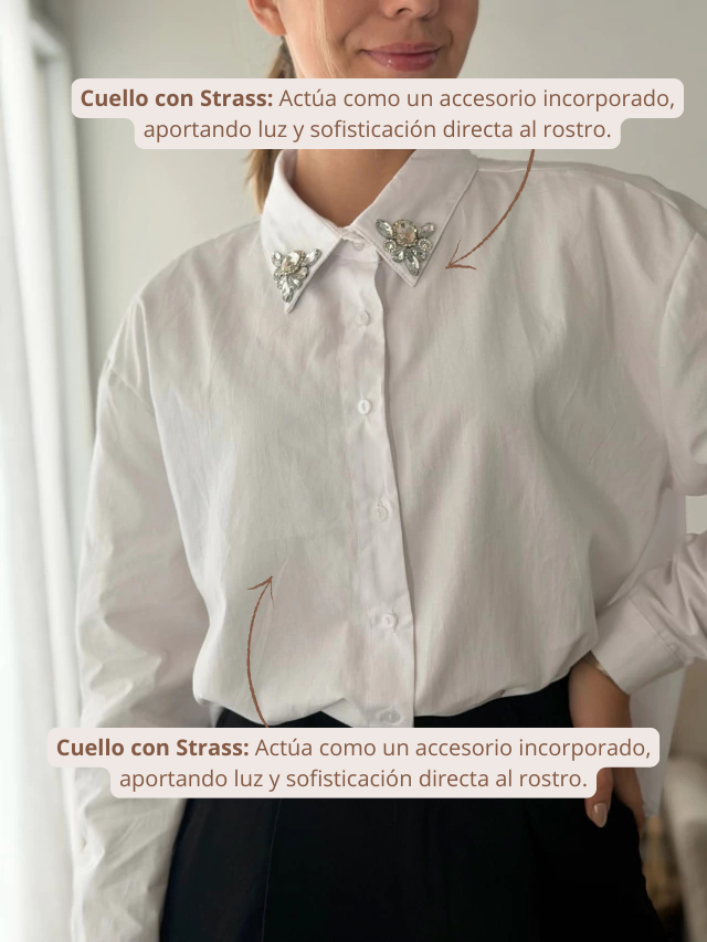 La Camisa Gala es la prueba de que se puede estar cómoda y sumamente elegante al mismo tiempo. Combina la versatilidad de una camisa básica con un toque de sofisticación inigualable: su cuello adornado con strass. Una prenda hermosa que marca la diferencia y eleva cualquier look sin esfuerzo.