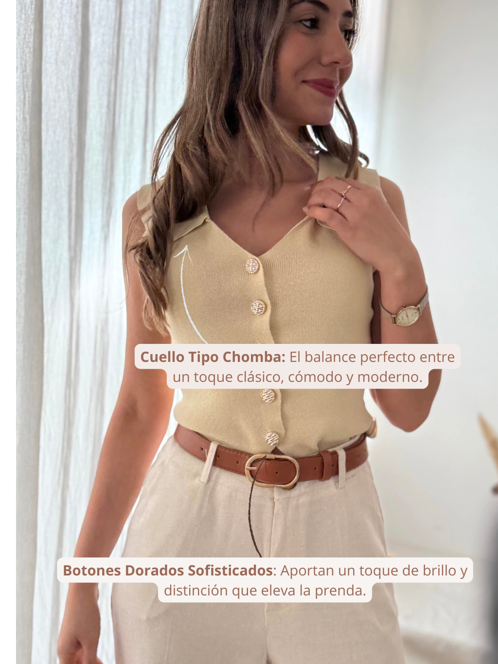 El Chaleco Safira combina un cuello chomba, botones dorados y un corte asimétrico en picos. La pieza ideal para un look elegante y moderno.