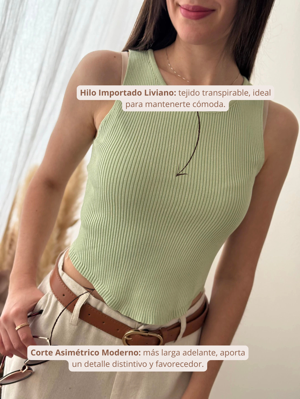 La Musculosa Emma combina hilo con un corte moderno más largo adelante. La pieza ideal para un look fresco y distintivo.