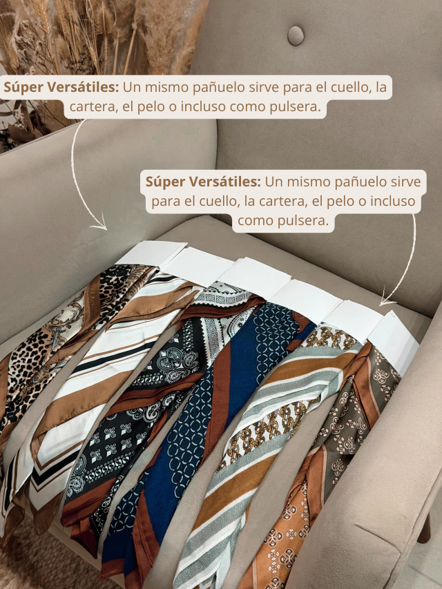 Los Pañuelos de seda se han convertido en la tendencia imprescindible de la temporada. Su textura ligera y variedad de colores aportan ese toque único y sofisticado que tu look necesita. Ya sea anudado al cuello, adornando tu cartera favorita o incluso en el cabello, es un accesorio versátil, elegante y súper funcional.