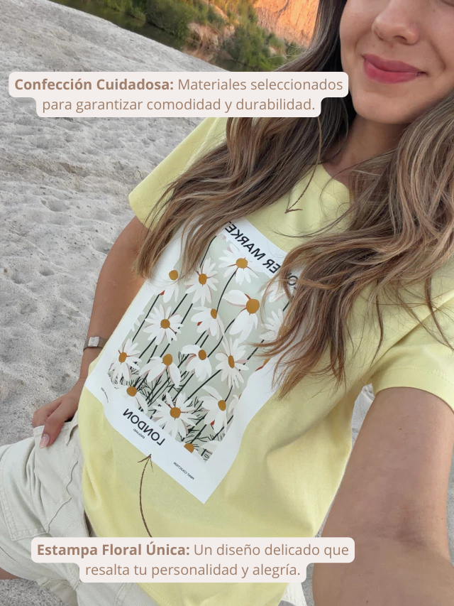 La Remera Almendra Flower combina un vibrante color amarillo con una delicada estampa floral. La prenda ideal para aportar frescura, personalidad y alegría a tus días.