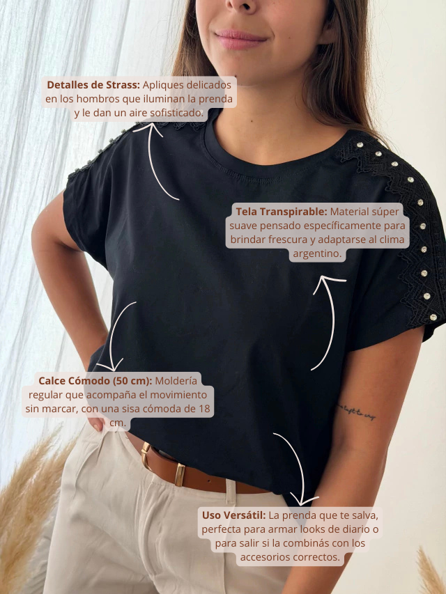 La Remera Milenia es la pieza clave para elevar tu estilo cotidiano. Confeccionada en una tela súper suave y transpirable, es perfecta para adaptarse al clima argentino. Sus delicados apliques de strass en los hombros aportan ese toque de luz y elegancia que te permite usarla tanto para un look relajado de día como para un evento casual.