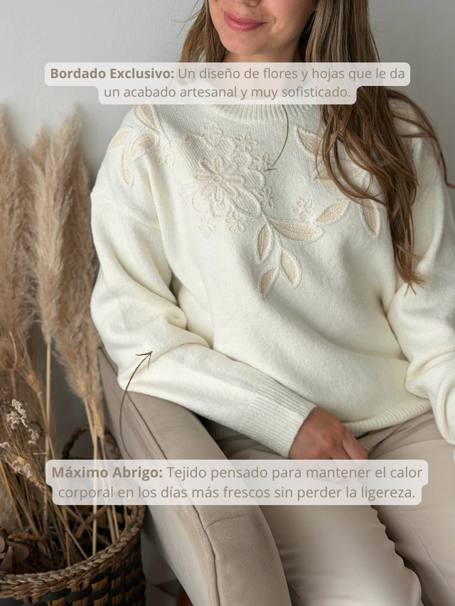 El Sweater Alba es la prenda que combina confort térmico y estilo en un solo diseño. Sus tonos neutros lo vuelven ultra versátil para cualquier ocasión, mientras que su delicado bordado de flores y hojas aporta ese toque femenino que realza tu outfit sin perder la elegancia natural. Sentite cómoda y distinguida durante todo el día.